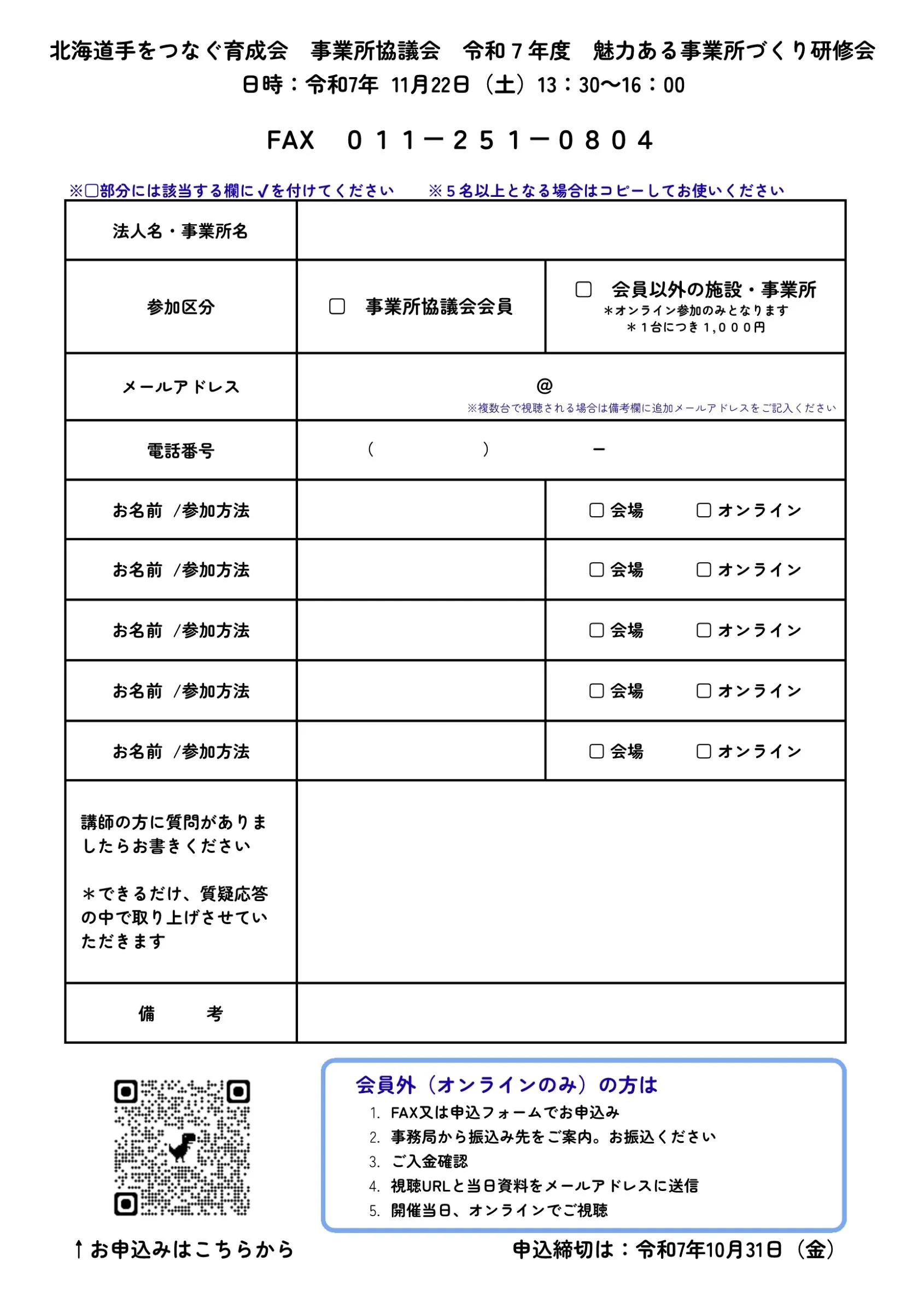 すべてのイベントに戻る 令和7年度魅力ある事業所づくり研修会 2025年11月22日土曜日 13:30 16:00 Googleカレンダー ICS PDF資料ダウンロード お申込みはこちらから(Googleフォーム)